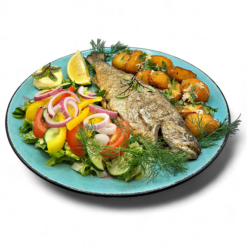 Delikatny pieczony pstrąg z opiekanymi ziemniakami i świeżą sałatką z warzyw